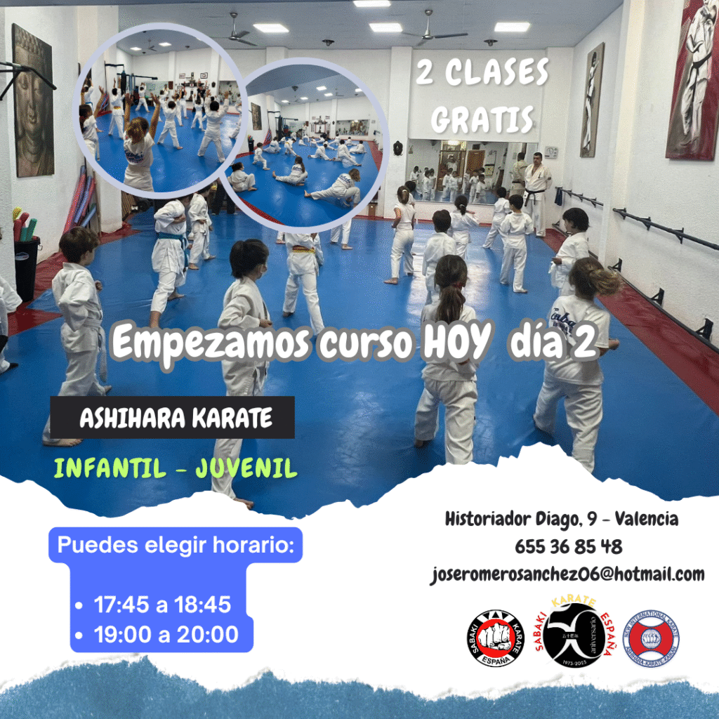 ¡¡¡Empezamos curso de Ashihara Karate HOY 2 DE OCTUBRE!!! Posted on 2 octubre, 2025 por José Vicente Notario Infantil y juvenil. ¿Quieres probar Ashihara Karate? Tienes dos clases gratis. ¡Te esperamos!
